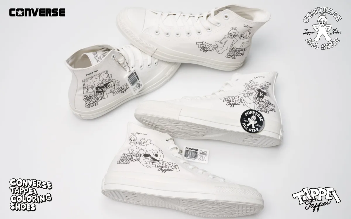 デザインには「CONVERSE TAPPEI COLORING SHOES」や「Right Page」「Left Page」といった遊び心溢れるキーワードが散りばめられています。左右のアッパーそれぞれに2パターン、タン部分にも同様に2パターンのデザインが準備されているため、自分だけのスタイルを作り上げる楽しみが広がります。
