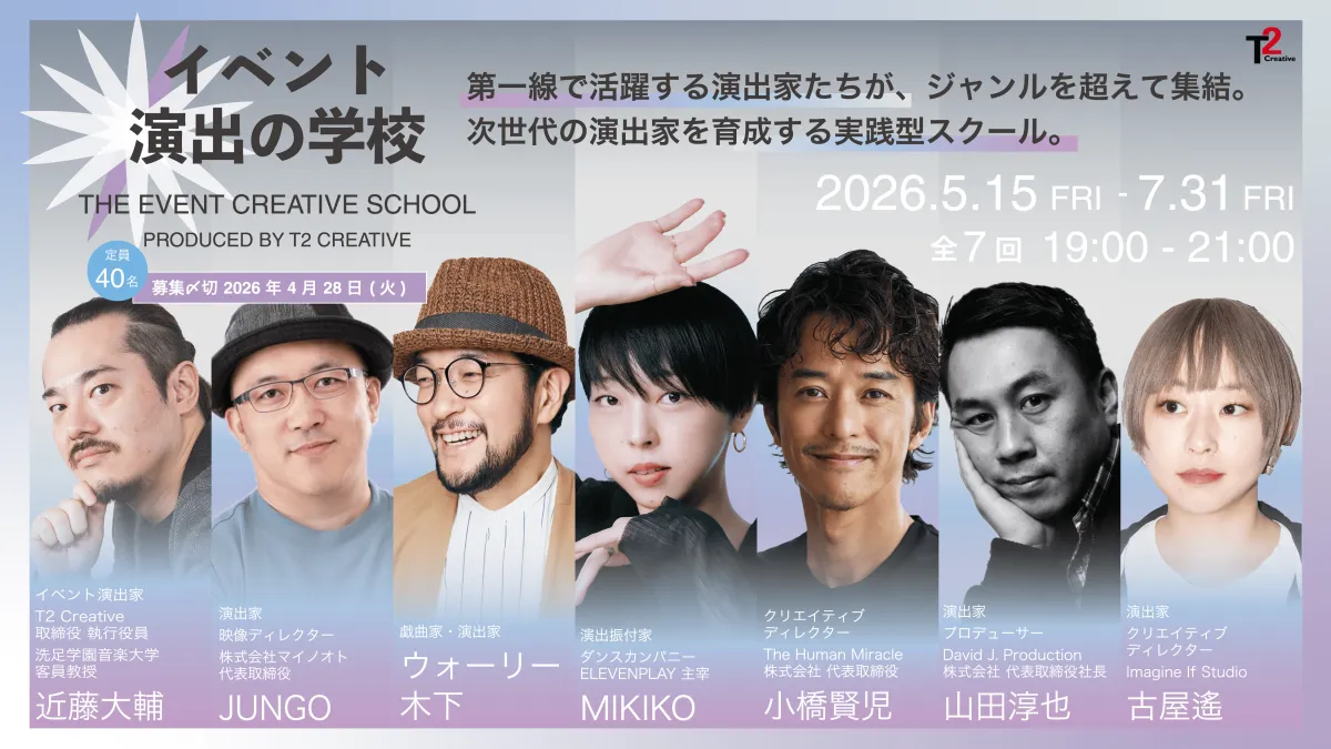 「イベント演出の学校」は、2026年5月から7月にかけて全7回のプログラムが行われます。毎週金曜日の19:00から21:00まで、ティー・ツー・クリエイティブの本社にて開催され、対象は演出家を目指す18歳から30歳までの学生や社会人です。定員は最大40名で、応募者が多数の場合は抽選にて選ばれます。受講料は一般40,000円、学生20,000円となっており、申し込みは特設サイトから行えます。