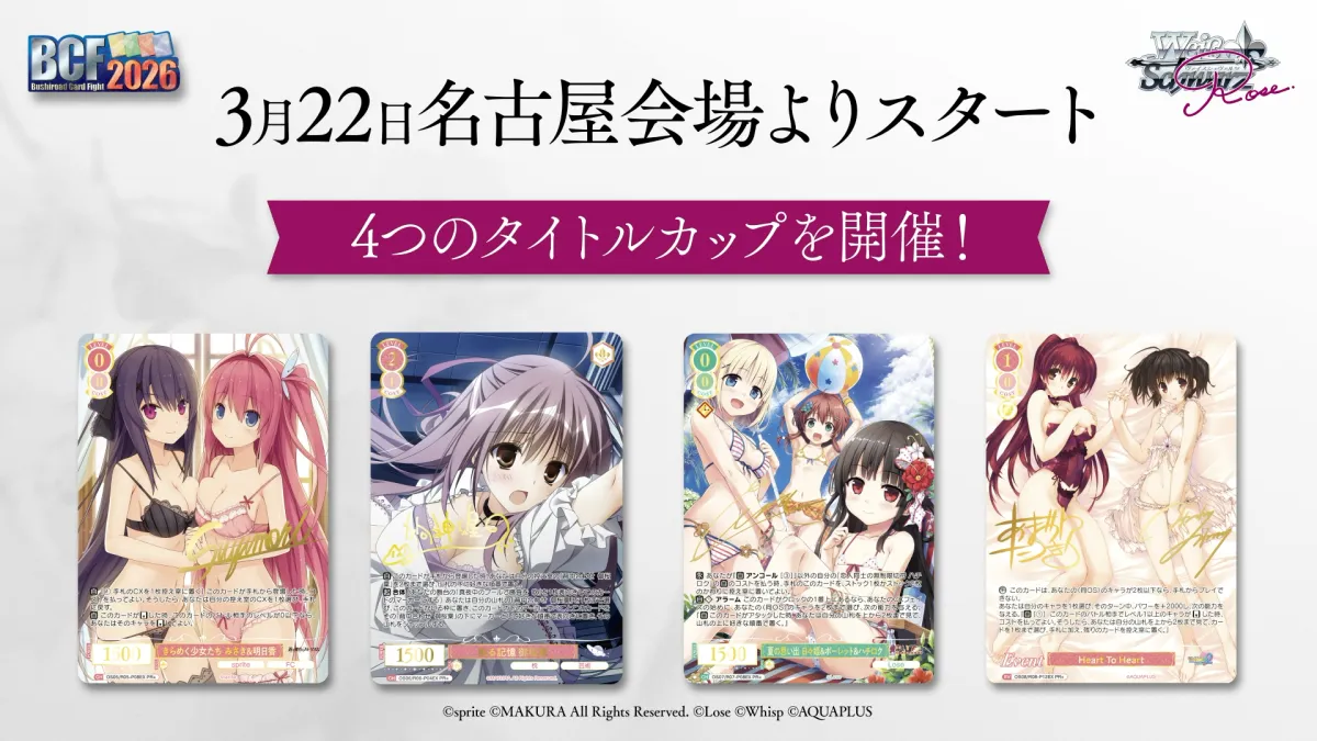 今後行われるイベントの一つ、BCF2026(ブシロードカードファイト2026)では、名古屋を皮切りに4つのタイトルカップが開催されることが決定しました。この大会では参加者に豪華な景品が用意されており、カードゲームを楽しむ絶好の機会です。詳細は、ヴァイスシュヴァルツロゼの公式サイトでチェックできます。