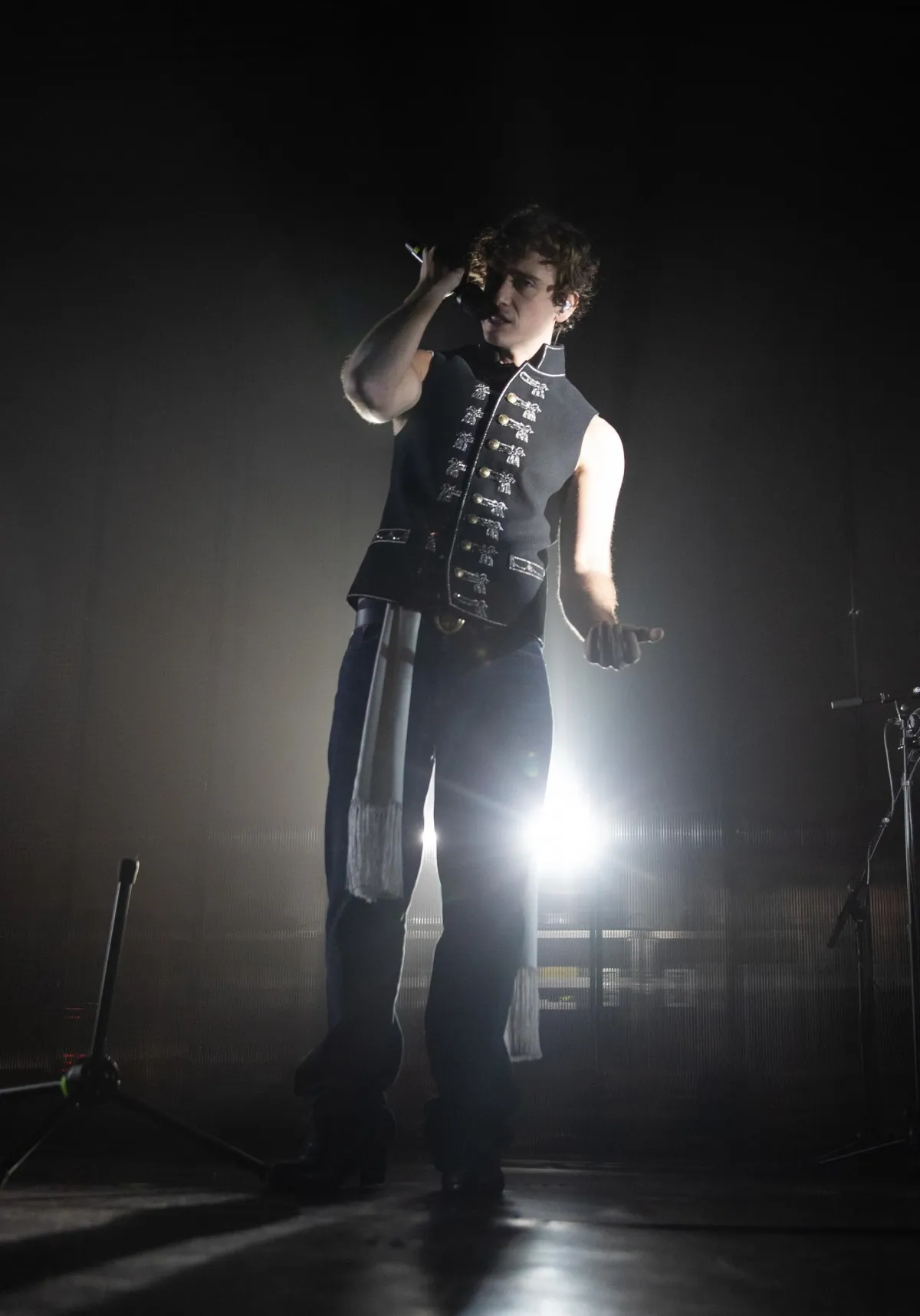 ギタリカデラフエンテが選んだファッションは、ブランデンブルク刺繍が施されたブラックウールのオフィサーカラーベストが特徴です。このベストは、伝統的なデザインに現代的な解釈が加えられたもので、彼の個性を見事に引き立てています。デニムスタイルのブルーのジーンズと組み合わせることで、エレガントさとカジュアルさを絶妙に調和させました。