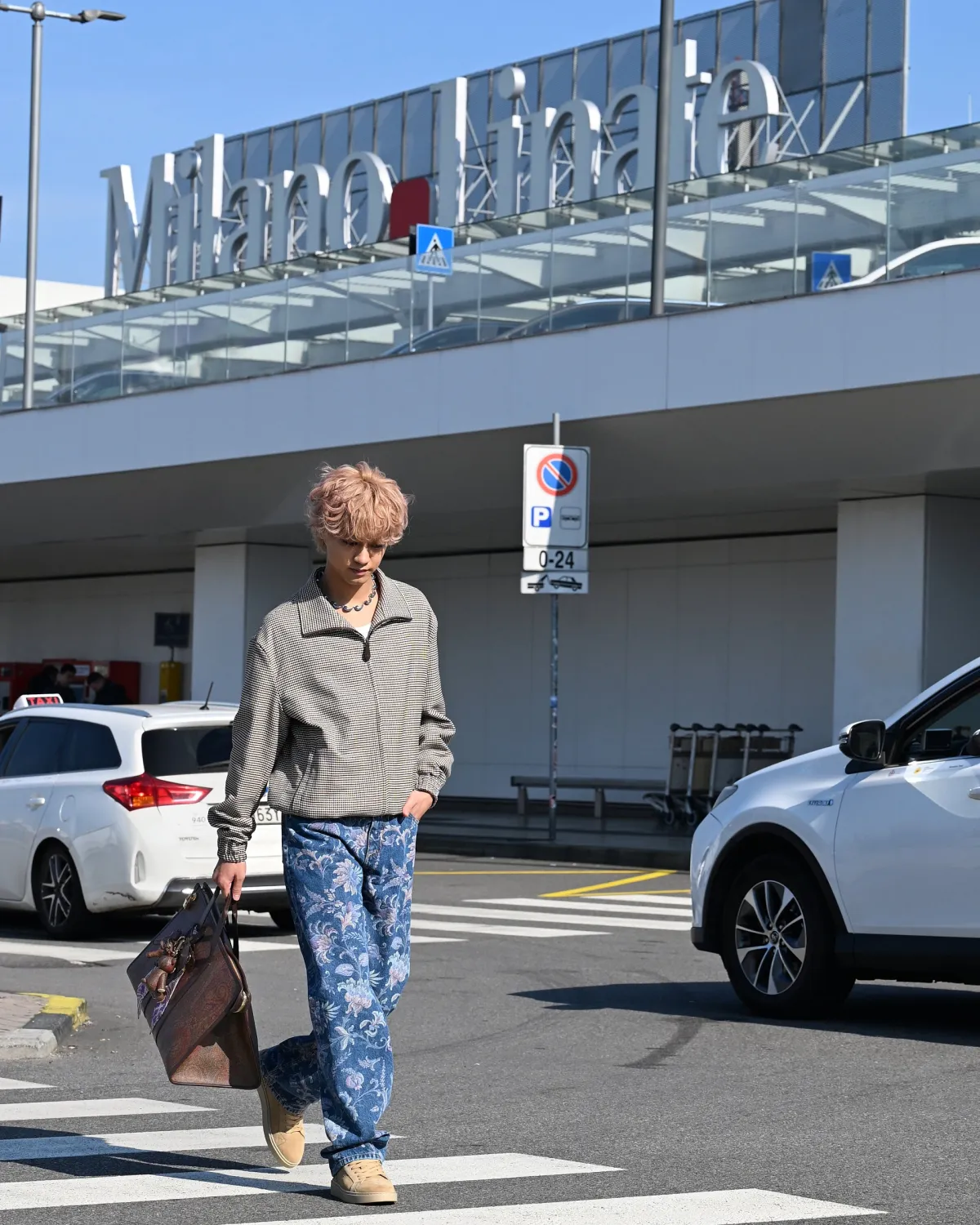 到着時の髙橋は、ブラウンの格子柄が印象的なボックスシルエットのスタンドカラージャケットに、ハイビスカスモチーフのプリントが施されたデニムを組み合わせた独特なスタイルを披露しました。そのファッションセンスは間違いなく光り輝いています。特に目を引くのは、彼が手に持つエトロのシグネチャーであるアルニカのトラベルバッグです。このバッグには同素材で作られたクマのチャームや、ペガソのチャームが飾られ、さらに彼自身がデザインしたペイズリーナが添えられており、遊び心満載のスタイルを演出しています。
