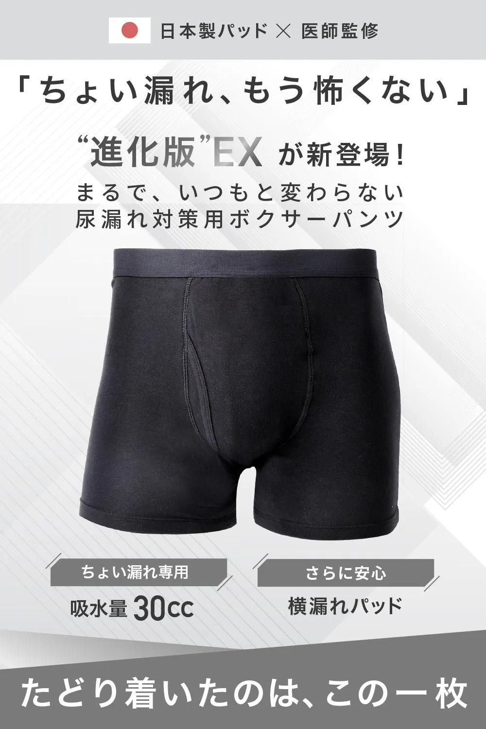 『暮らしの安心ボクサーパンツEX』は、男性特有の軽度尿もれを自然な形でケアできる製品です。見た目は普通のボクサーパンツと変わらず、履き心地も良好。吸水パッドを内蔵しているため、わずかな残尿をしっかり吸収し、検出することが可能です。