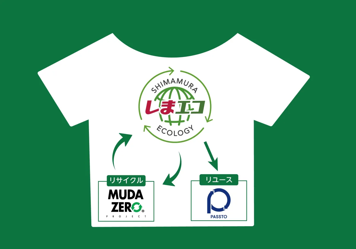 リサイクル(再生利用) : 株式会社カイタックファミリーの「MUDA ZERO」プロジェクトを通じて、衣料品から新たな衣類が生まれます。2025年度からはこのプロジェクトで再生された素材を使用した商品が販売される予定です。