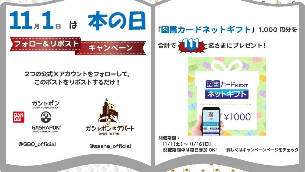 この特別キャンペーンは、11月1日(土)から11月16日(日)までの期間中に実施されます。この期間中、バンダイナムコのカプセルトイ専門店を訪れた方は、X(旧ツイッター)の指定アカウントをフォローし、キャンペーンポストをリポストすることで、抽選で111名に「図書カードネットギフト」1,000円分をプレゼント!毎日応募できるチャンスもあるので、何度でも挑戦が可能です。