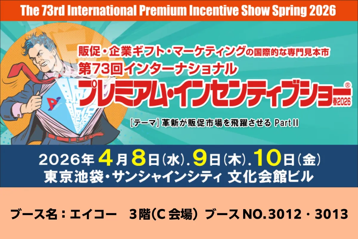 2026年の春、株式会社エイコーが「第73回インターナショナルプレミアム・インセンティブショー春2026」に出展することが決まりました。このショーは東京池袋のサンシャインシティ文化会館ビルで、4月8日から10日までの間、販促業界の専門家や企業関係者が一堂に会する大規模な見本市です。