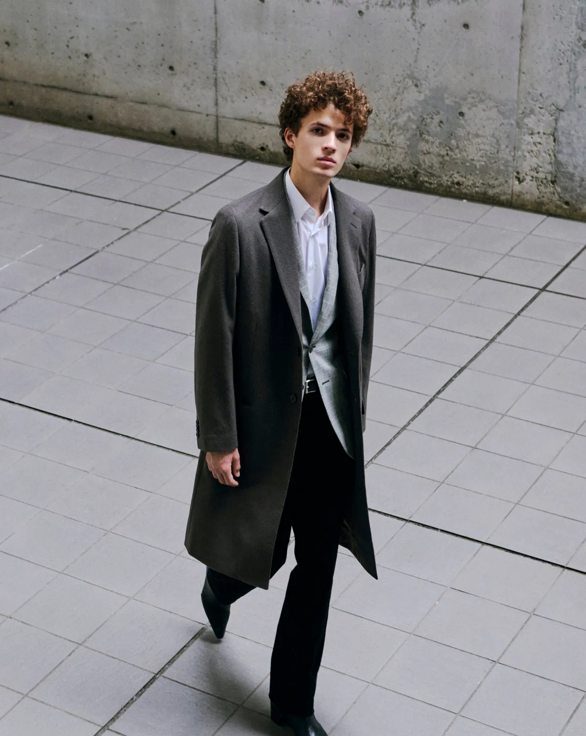 「東京で働く1日」をテーマにしたセクションでは、シックで上品なビジネススタイルが提案されています。広場やオフィスといったシーンを背景に、王道のウールコート及び機能性に優れたチェスターコートが featuredされています。体の動きに合わせた素材感と構造で、どんな環境でもスマートに決まるスタイルを実現しました。