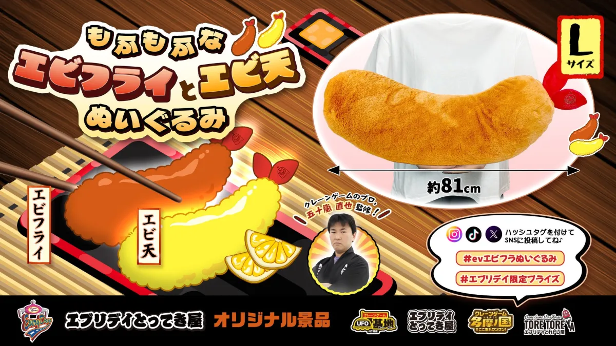 このエビフライとエビ天ぬいぐるみは、2026年3月11日(水)より、エブリデイ行田店、エブリデイとってき屋東京本店、エブリデイ多摩ノ国店、エブリデイとれトレ屋桶川店で発売予定です。サイズは約81㎝で、種類はエビフライとエビ天の二種類から選べます。