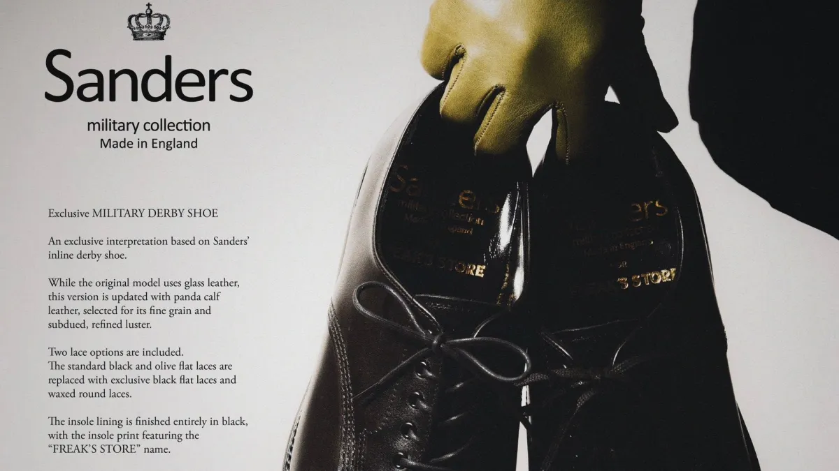 老舗シューメーカーのSandersがFREAK'S STOREのために特別に仕上げたシューズ、『MILITARY DERBY SHOE』が発表されました。この一足は、従来の光沢感のあるポリッシュドレザーではなく、マットな質感のパンダカーフを使ったことが大きな特徴です。これは、FREAK'S STOREのスタイルを反映するための別注によるものです。