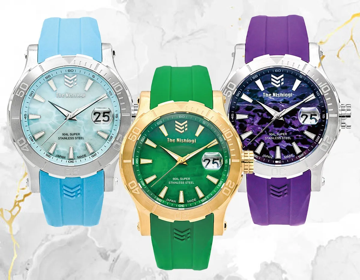 The Nishiogiは、前作のラピスラズリ&ターコイズモデルで高く評価され、その後さらに進化した天然石文字盤シリーズを展開しています。新作は、0.4mmという極薄スライス加工を施した天然鉱物を使用し、自然の美しさを引き立たせるデザインが特徴です。