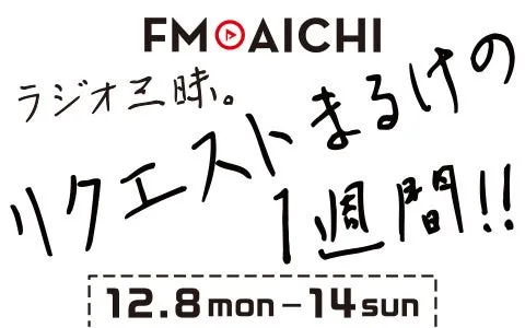 FM AICHI(名古屋 FM80.7MHz / 豊橋 FM81.3MHz)では、2025年12月8日(月)から12月14日(日)までの1週間にわたり、「FM AICHIリクエストまるけの1週間」を実施します。この企画は、日頃からFM AICHIを支えてくれているリスナーへの感謝の気持ちを込めて行われるもので、リスナー参加型のリクエスト企画が盛りだくさんです。