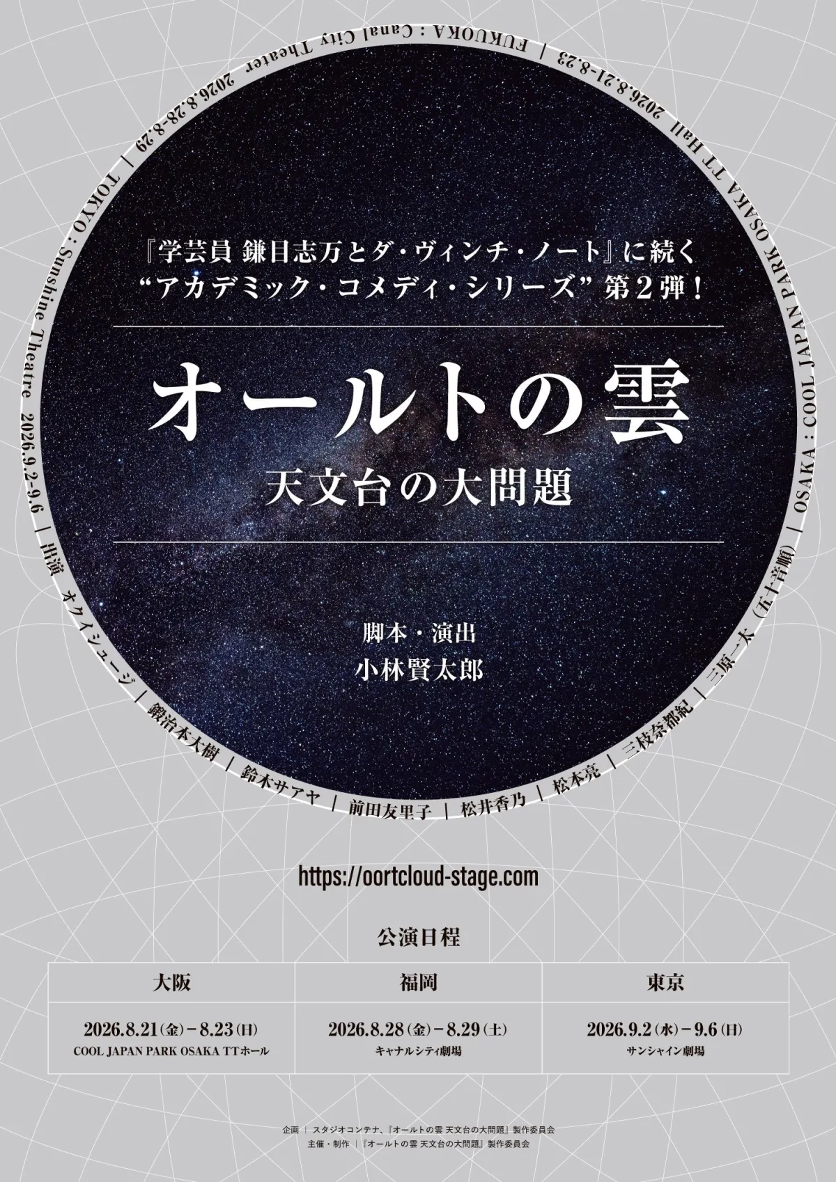 劇作家小林賢太郎による新作舞台『オールトの雲 天文台の大問題』が、2026年8月から9月にかけて大阪、福岡、東京で上演されることが発表されました。この舞台は、2025年に上演された『学芸員 鎌目志万とダ・ヴィンチ・ノート』に続く“アカデミック・コメディ・シリーズ”の第2弾として期待されています。脚本と演出を手掛けるのは前作と同様、幅広いジャンルで活躍する小林賢太郎です。