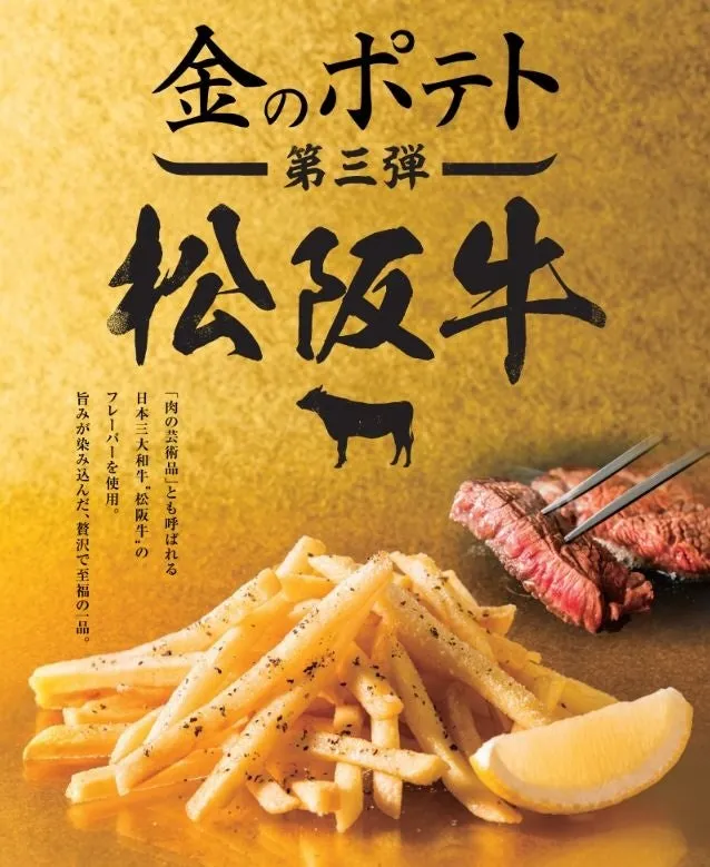 「金のポテト」は、これまでに松茸や白トリュフといった高級素材を用いて多くのファンを魅了してきた商品です。松阪牛のフレーバーは、これらに引き続き「高級感」「上質感」「希少性」などに特化した新たな挑戦としてラインアップに加わります。老若男女問わず楽しめる「旨味」を強調したこの商品は、まさに日本の食文化を愛する全ての人々に捧げられた逸品と言えるでしょう。