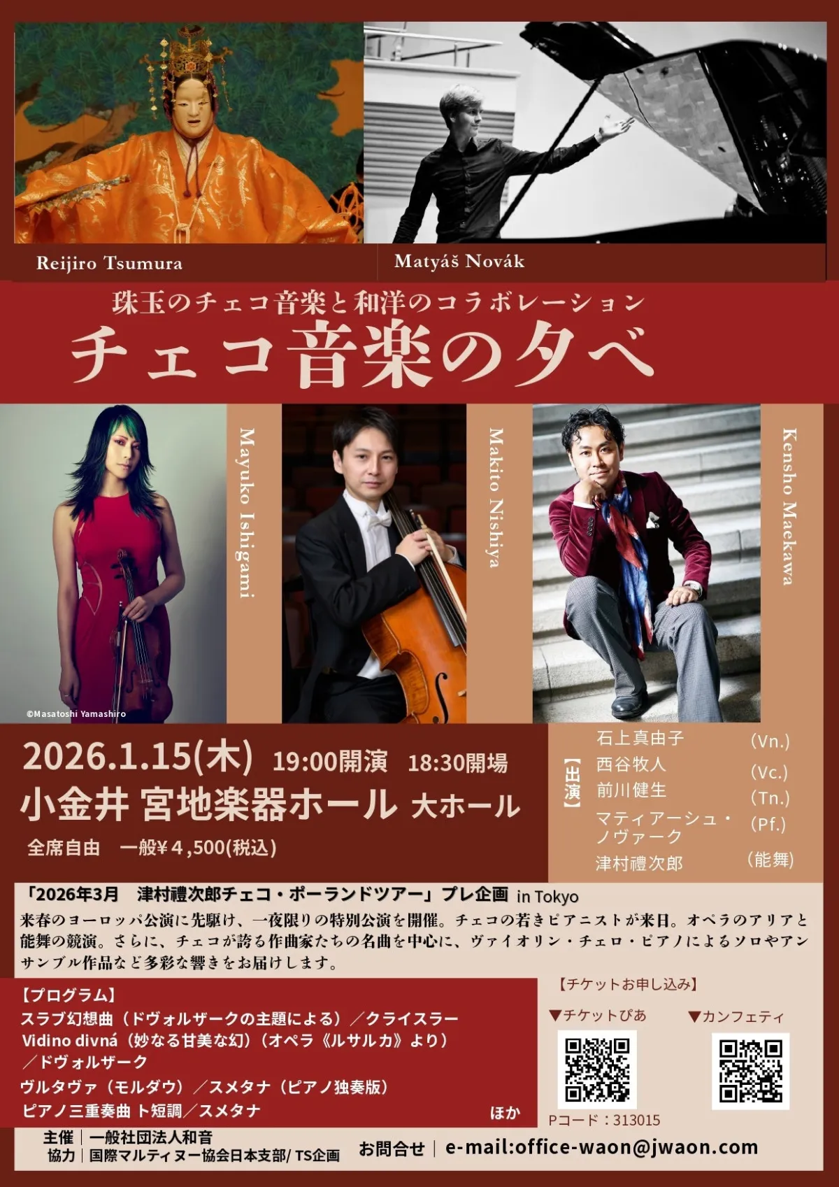 来春に控えるヨーロッパ公演を前に、能楽師 津村禮次郎による特別公演「チェコ音楽の夕べ」が2026年1月15日(木)小金井 宮地楽器ホールで開催されます。これまで日本の伝統文化を現代に伝えてきた津村が、今再び新たなページを開く瞬間です。