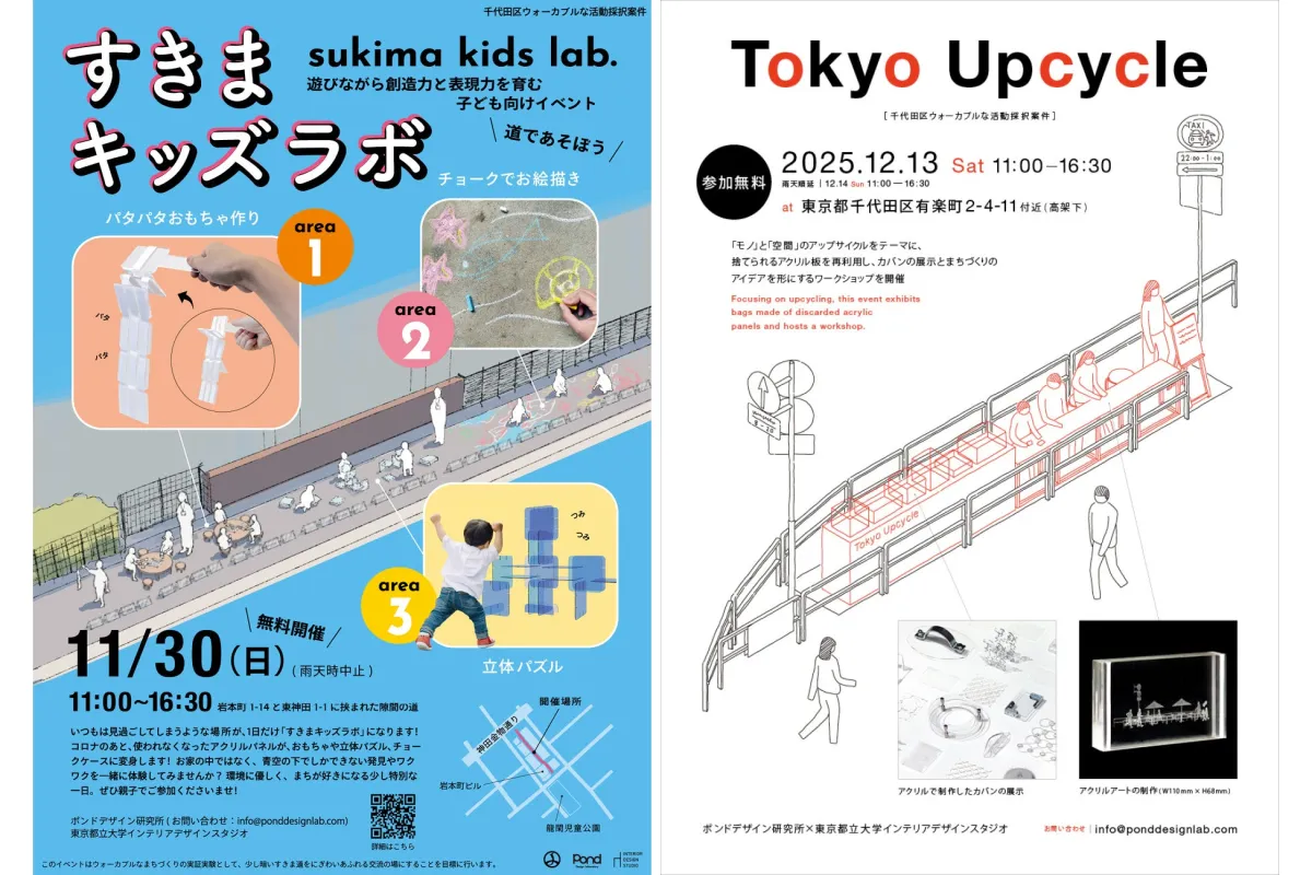 ポンドデザイン研究所は、東京都立大学のインダストリアルアート学科と手を組み、「ウォーカブルなまちづくり」をテーマにした2つのイベントを企画しています。これらのイベントは、「モノ」と「空間」のアップサイクルをテーマに、おもちゃや立体アート作品へと再利用される役目を終えたコロナ対策のパーティションを元にしています。また、地域の課題を解決し、環境に配慮した公共空間を創出することを目指しています。
