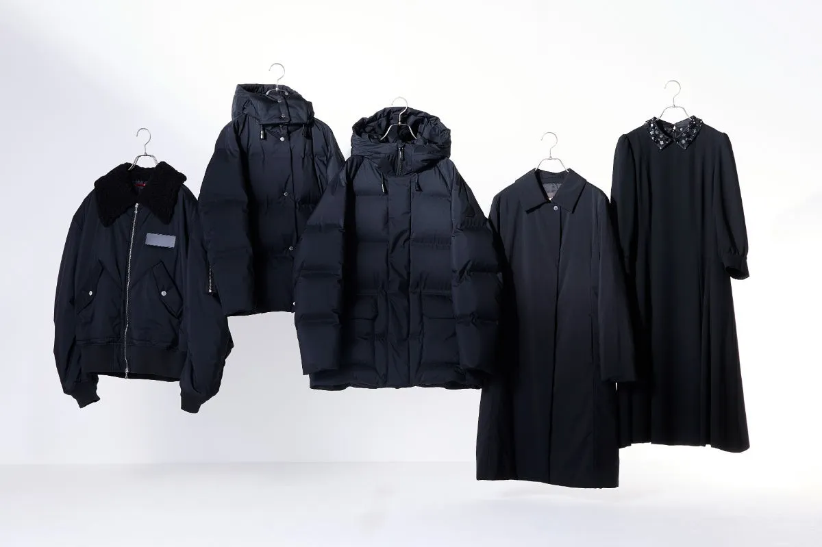 「BLACK OF BLACKs」のアイテムは、コート・アウターだけでなく、ドレスやバッグといった多彩なラインナップが用意されています。例えば、ナイロンやポリエステルを使用したコート、しなやかなポリエステルジョーゼットのドレス、耐久性の高いナイロンジャカードを用いたバッグなど、様々なシーンで活用できる商品が展開されます。