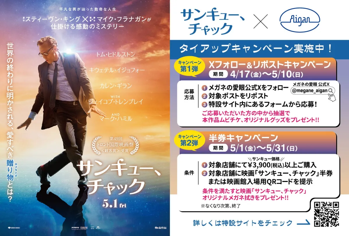 2026年4月17日から、愛眼株式会社がスティーヴン・キングの原作による感動ミステリー『サンキュー、チャック』の日本公開を記念し、特別なタイアップキャンペーンを実施します。このキャンペーンは、映画の公開日を盛り上げるための様々な企画を用意しており、多くのファンが楽しめるイベントになることでしょう。