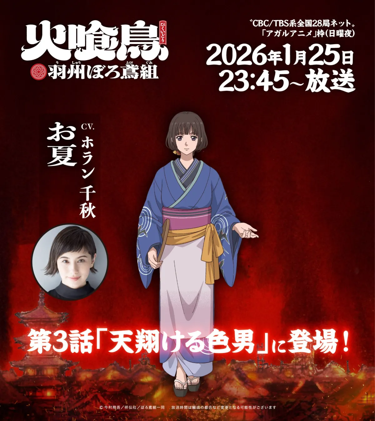 直木賞作家・今村翔吾の小説を原作とした大ヒットアニメ「火喰鳥 羽州ぼろ鳶組」が、ますます盛り上がりを見せています。最新エピソードである第3話「天翔ける色男」には、特別ゲストとしてホラン千秋さんが登場します。お夏役をつとめる彼女のフレッシュな演技に期待が高まります!