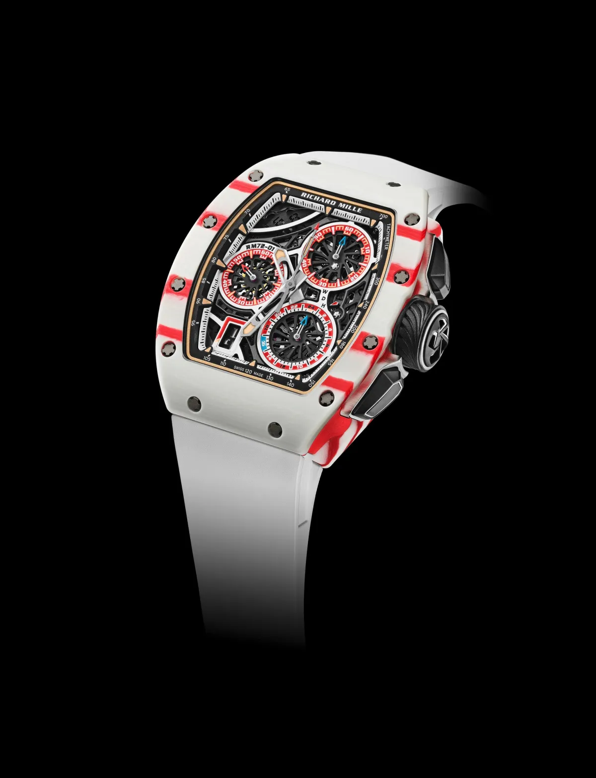 次に、シャルル・ルクレールが使用していたプロトタイプのRM 72-01 オートマティック フライバック クロノグラフをご紹介します。自社製キャリバーCRMC1を搭載した自動巻きモデルで、サイズは縦47.34mm × 横38.40mm × 厚み11.68mm。ホワイト&レッドクオーツTPT®ケースとベゼルが特徴で、パワーリザーブは約50時間です。こちらの参考価格は285,000CHFです。