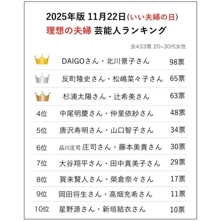 11月22日の「いい夫婦の日」にあたるこの日、花嫁アプリ「PLACOLE & DRESSY」を運営する冒険社プラコレが、20代から30代の花嫁インスタグラムユーザー433名を対象に実施した「2025年版 理想の芸能人/著名人夫婦ベスト10」調査の結果が発表されました。この調査は、SNSを通じてリアルな花嫁の声を集め、結婚式に関するリアルな情報発信を目的としています。