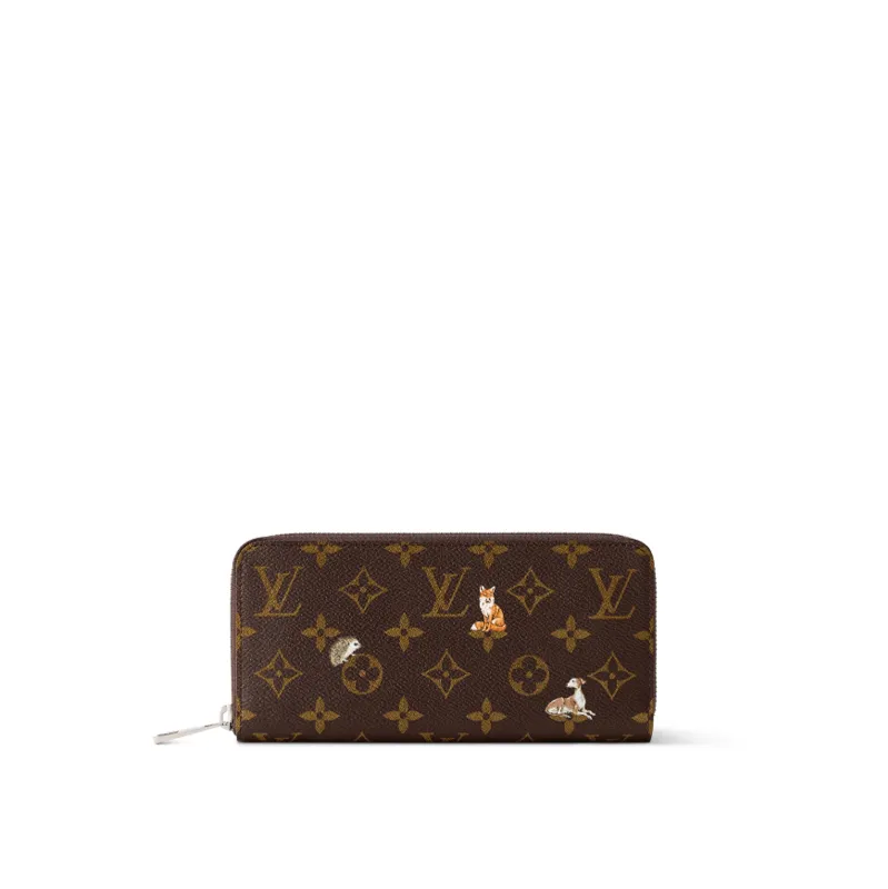 続いてご紹介するのは、クラシカルな長財布「ジッピー・ウォレット ホリゾンタル」です。こちらもモノグラム・フォレスト キャンバスを使用し、内装には動物モチーフが施されています。特に注目したいのは、LVイニシャルを飛び越える形でデザインされたキツネのエンボス加工です。複数のカードスロットや2つの紙幣用コンパートメント、コイン用のファスナー付きポケットが付いており、機能性も備えたアイテムです。