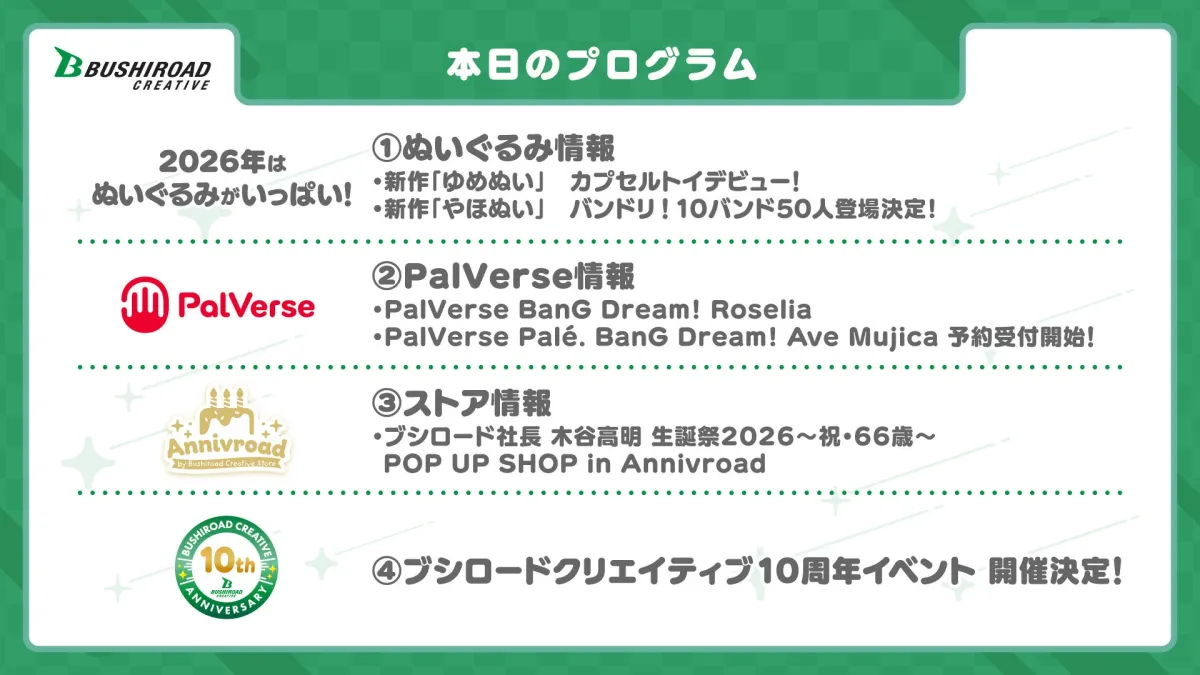 ブシロードクリエイティブの今後の展開やイベント情報は公式サイトやSNSで随時更新されるとのことなので、ぜひチェックしてみてください。お楽しみが盛りだくさんの2026年を一緒に迎えましょう!