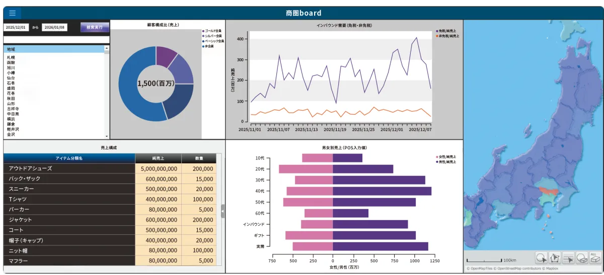 導入されたMotionBoardは、従来の商圏分析において重要な役割を果たします。顧客の構成比やインバウンド需要、売上状況を地図機能を用いて視覚化し、店舗別の売上構成や進捗状況もリアルタイムで確認できるようになりました。また、販売員は前年対比や会員のランク変化を一目で把握できるため、業務の効率化が図られています。