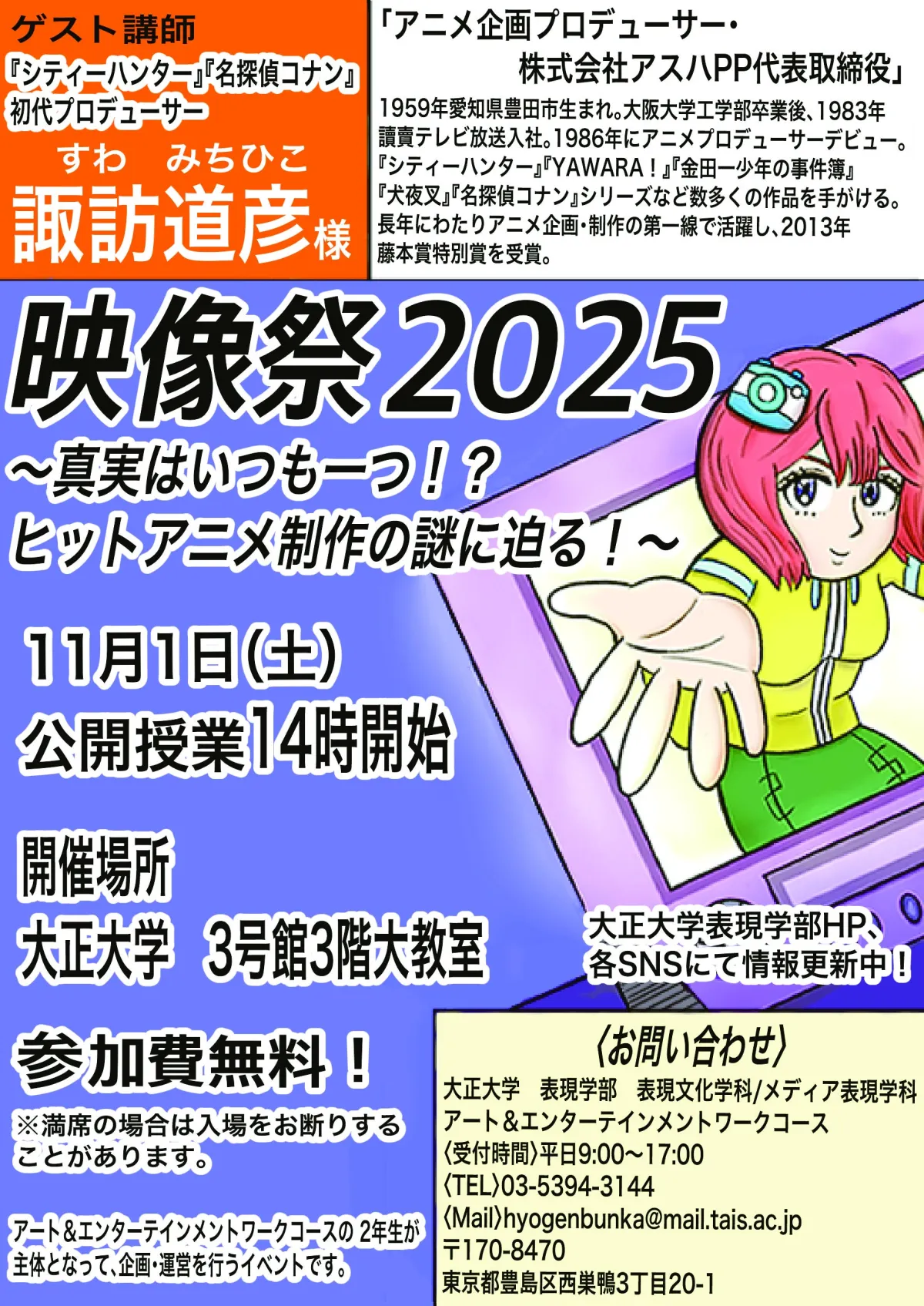 大正大学表現学部が主催する毎年恒例のイベント、「映像祭2025」が2025年11月1日(土)に開催されます。これは、メディア表現学科のアート&エンターテインメントワークコースに在籍する2年生たちが主体となって企画・運営するプロジェクトで、今回のテーマは「真実はいつも一つ!?ヒットアニメ制作の謎に迫る!」となっています。