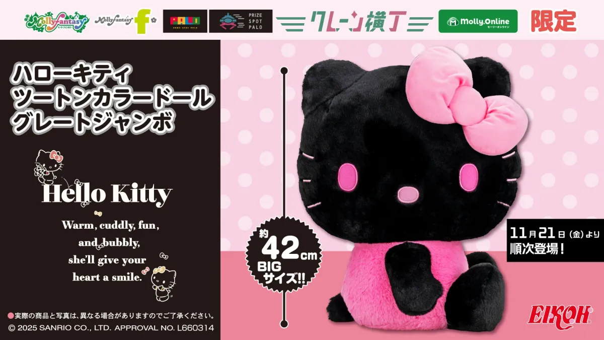 人気キャラクター「ハローキティ」のビッグサイズぬいぐるみ『ハローキティ ツートーンカラードールグレートジャンボ』が、11月21日(金)からモーリーファンタジーおよびPALOで展開されます。このアイテムは、約42cmの大きさを誇り、ピンクとブラックのツートンカラーでデザインされた、可愛さと存在感を兼ね備えた一品です。