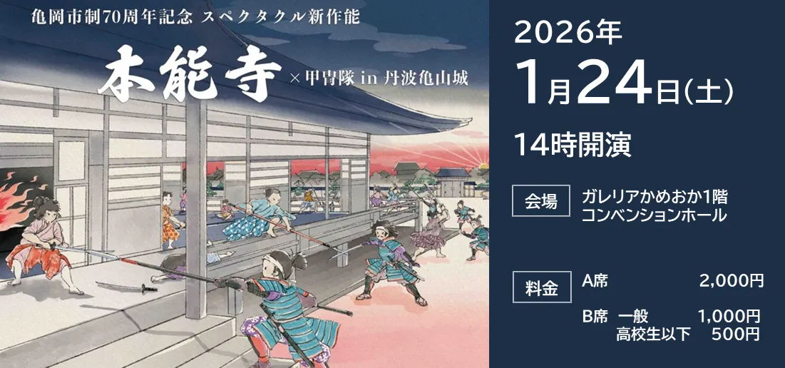 京都府亀岡市で、令和8年(2026年)1月24日(土)に、新作能『本能寺』の上演が行われることが決まりました。このイベントは、亀岡市制70周年を記念して、亀岡光秀まつり実行委員会が主催し、地域の文化と芸術を発信する一環として制作されました。