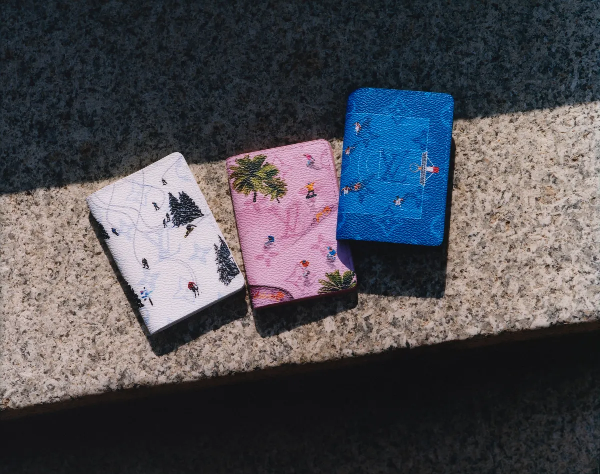 新作には、カードケース、財布、パスポートカバーなどが含まれており、すべてのアイテムはカラフルなモノグラム・キャンバスを使用しています。空の上から見たようなミニチュアのスポーツシーンがデザインに組み込まれ、特に注目されるのが、青空の下のバスケットボールコートや美しい夕焼けのスケートパークを描いたアートです。