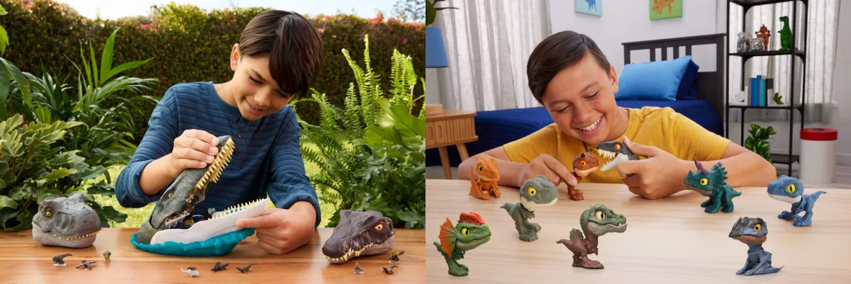 そして、もう一つの新商品「ジュラシック・ワールド かみかみ恐竜コレクション Dアソート」は、手のひらサイズで持ち運びも簡単。頭を押すことで、その表情を変化させられます。かわいい顔から牙をむき出した猛々しい顔まで、どの恐竜を選んでも違った動きを楽しめるのが魅力です。
