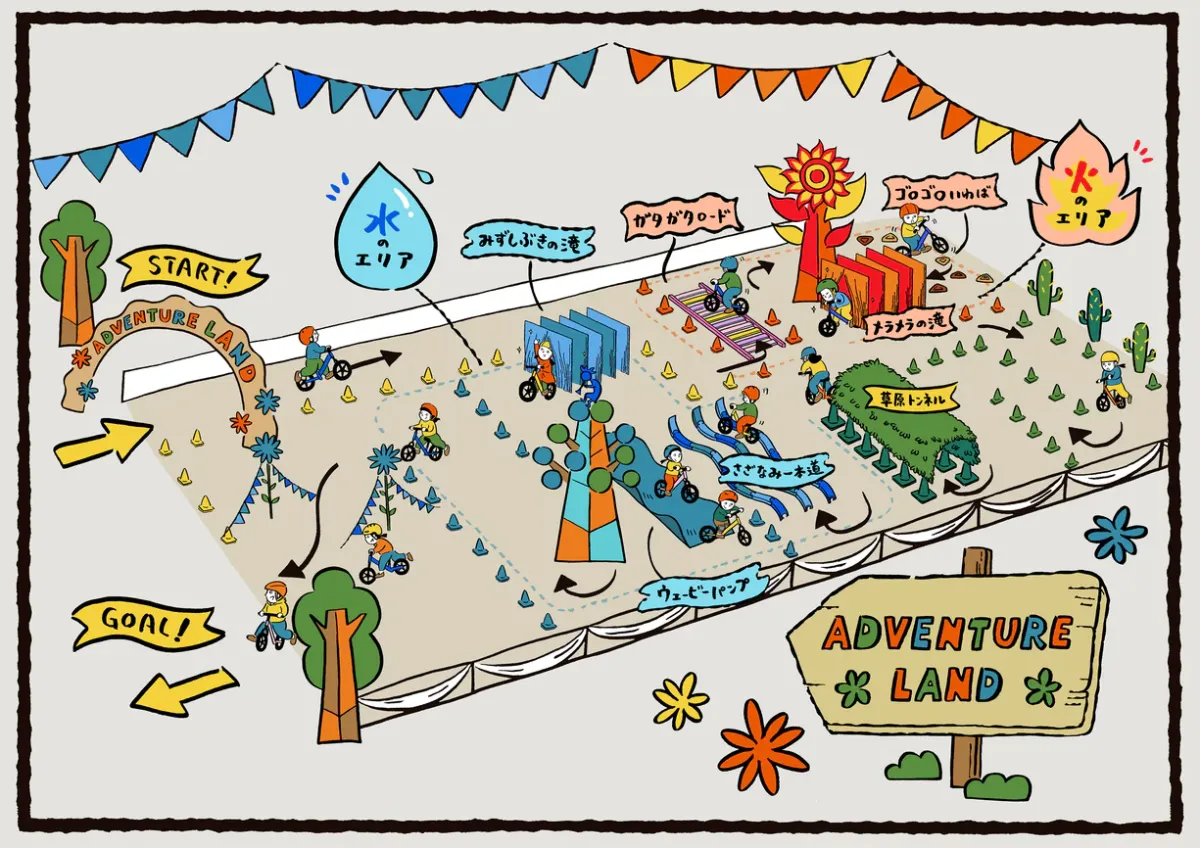 ストライダーをまだ持っていないお子さまでも安心して楽しめる「アドベンチャーランド」では、全長100mを超える巨大な試乗コースが用意されています。レンタルのストライダーを使用できるため、初めての経験でも安心して参加できます。コースは「火のゾーン」と「水のゾーン」に分かれており、さまざまなチャレンジポイントが散りばめられています。子どもたちは、想像力をかきたてられる環境の中で楽しむことができます。