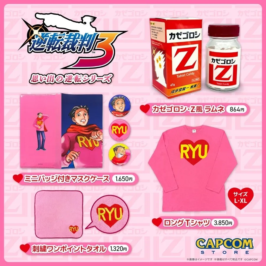次にご紹介したいのが「ミニバッジ付きマスクケース」。この商品は、直径32mmのミニ缶バッジが3種類付属しており、あなたの日常のマスクをスタイリッシュに演出します。さらには「刺繍ワンポイントタオル」も同時に登場し、ハンカチとしてもタオルとしても使える便利なアイテムです。また、「カゼゴロシ・Z」をイメージしたラムネ菓子も加わり、成歩堂龍一も愛飲するこのアイテムは、ゲームファンならずとも興味をそそります。証拠品としては提出できないので、その点だけはご注意ください!