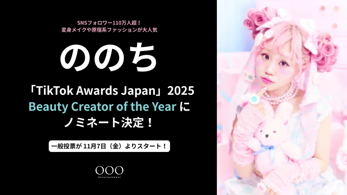 女性クリエイターレーベル「OOO Entertainment」に所属する「ののち」が、2025年の「TikTok Awards Japan」における「Beauty Creator of the Year」部門にノミネートされました。このニュースは、株式会社BitStarが運営するレーベルの活動の一環として発表されたもので、彼女のクリエイティブなコンテンツが高く評価されたことを示しています。