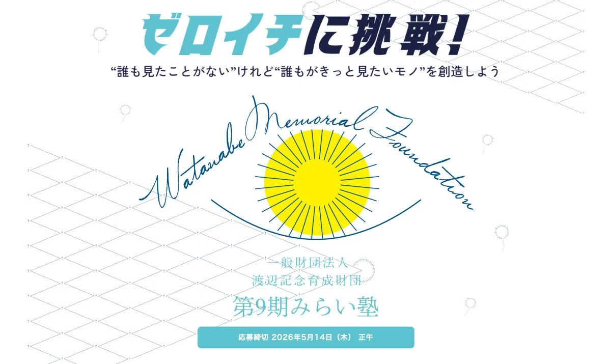 一般財団法人渡辺記念育成財団が主催する『みらい塾』の第9期生募集が始まりました。新たな価値を創出する『ゼロイチ』の精神をもって、クリエイティブな才能を育成するこのプログラムは、ただの学びの場に留まらず、未来への一歩を踏み出すための重要な機会を提供します。