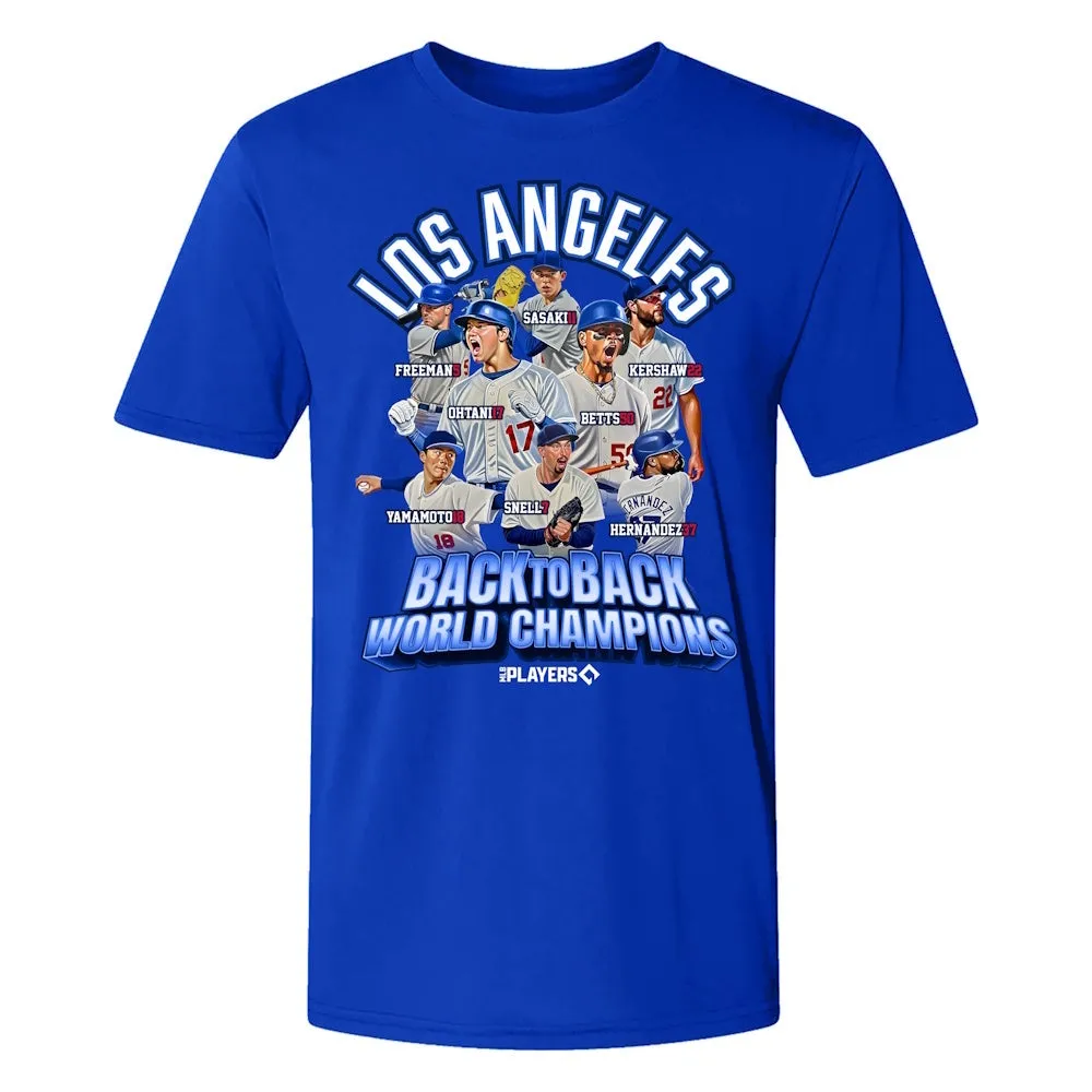 このTシャツは、ドジャースの連覇を称える特別デザインが施されています。チームを支えたスター選手たち—大谷翔平、山本由伸、ムーキー・ベッツ、クレイトン・カーショウ、フレディ・フリーマン、ブレイク・スネル、キケ・エルナンデス、そして佐々木朗希—が描かれ、まさに“ドリームチーム”とも呼ぶべきメンバーです。それぞれの選手が持つエネルギーが表現されており、見ているだけで興奮を覚えます。