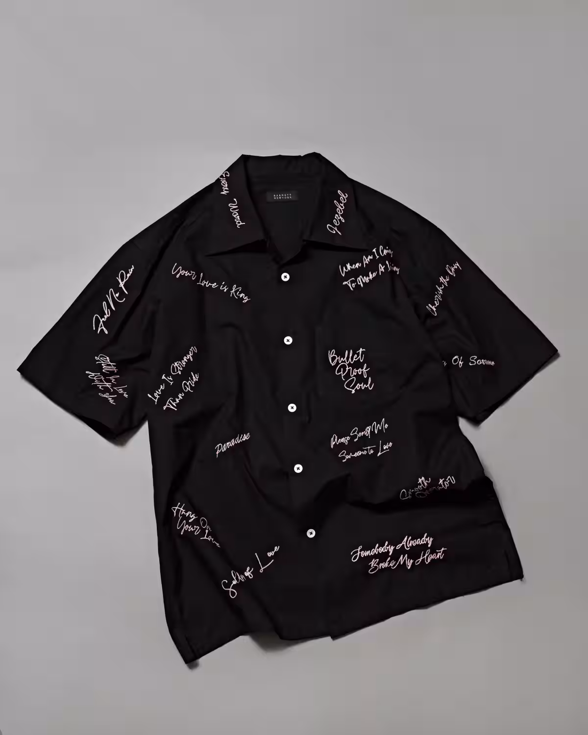 もう一つのアロハシャツは、コットンポプリン素材で、楽曲名が総刺繍で施されています。手間暇かけた特別な製法による高いクラフツマンシップが魅力です。色彩にもこだわり、視覚的にインパクトのあるアロハシャツに仕上げられています。