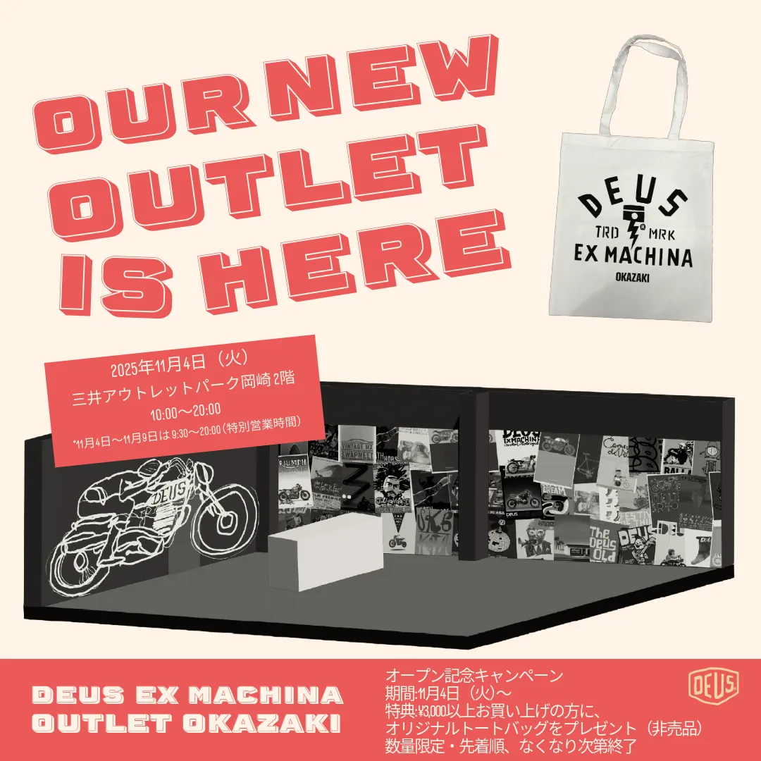 シドニーを拠点とするライフスタイルブランド「DEUS EX MACHINA(デウス エクス マキナ)」が、2025年11月4日(火)、三井アウトレットパーク岡崎に国内初となるアウトレット店舗をオープンします。この新たな店舗の開店により、東海エリアでもデウスの魅力が体験できる機会が広がります。