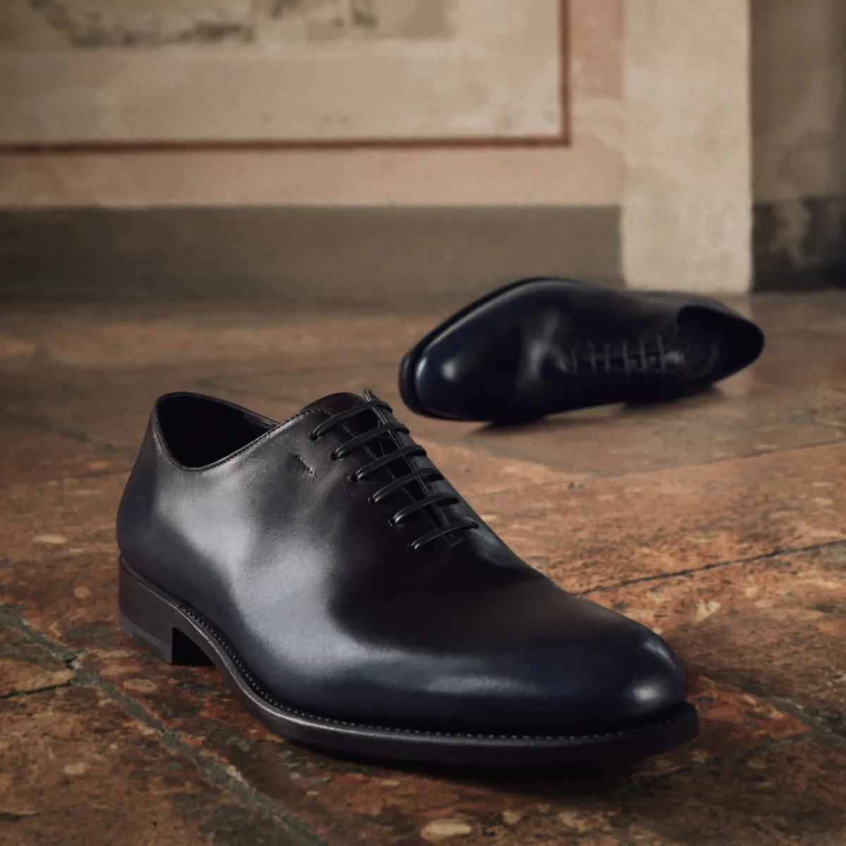 特に注目したいのは、バフドカーフスキンを用いたオックスフォードシューズです。このシューズは、隠しレース構造を採用しており、見た目にトラディショナルな佇まいを保ちながら、現代的なデザインに仕上がっています。ハンドステッチのディテールも施されており、その絶妙な仕上げが端正なフォルムにさらなる豊かさを与えています。