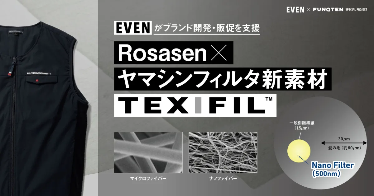 この新素材を使用した商品として、EVEN別注の「Rosasen × TEXIFIL™ VEST」が登場します。販売価格は29,700円(税込)、サイズはM、L、XLの3種類、カラーはシックなブラックです。販売は2025年11月28日に開始され、限定25着のみの販売となります。