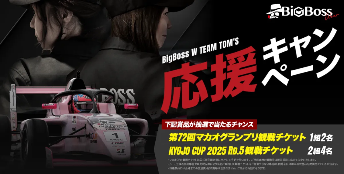 2025年10月12日、富士スピードウェイで開催される「KYOJO CUP 第4レース 決勝」に際し、アパレルブランドのBigBossWearは「BigBoss W TEAM TOM’S 応援キャンペーン」を展開します。このキャンペーンでは、特別なオリジナル缶バッジを配布し、さらに観戦チケットを手に入れるチャンスを提供します。