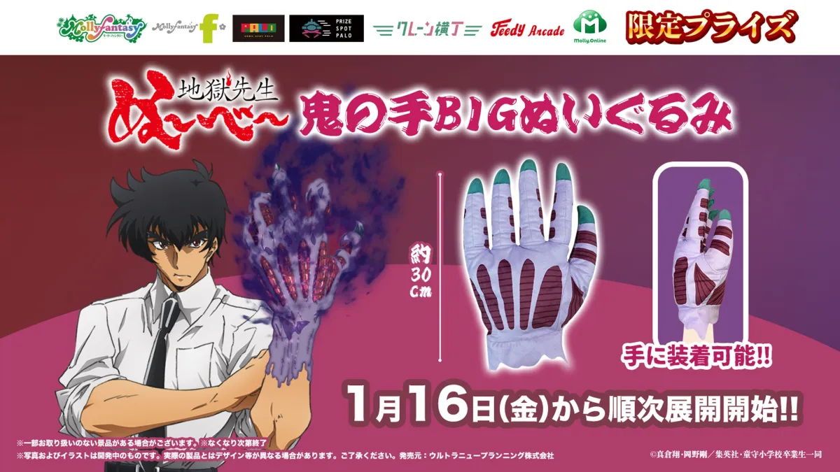 2026年1月16日(金)、アミューズメント施設『モーリーファンタジー』と『PALO』にて、新アニメ『地獄先生ぬ~べ~』の限定プライズ「鬼の手BIGぬいぐるみ」が登場します。このぬいぐるみは、直接手に装着可能で、主人公ぬ~べ~になりきれるユニークな製品です。
