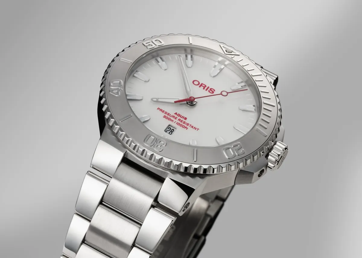 日本で特に愛される「アクイス デイト レリーフ」を基にしたこの時計は、エレガントさを表現するホワイトダイヤルと情熱的なレッドのロゴ、秒針を融合しています。ホワイトが持つ純粋さと洗練さは、どんなシーンでも調和し、見た人を惹きつけます。一方で、レッドの仕上げが力強い個性を引き立て、視認性も高めます。この配色は、日本とスイスの国旗に通じるもので、オリスが日本文化に対して抱く敬意を感じさせます。