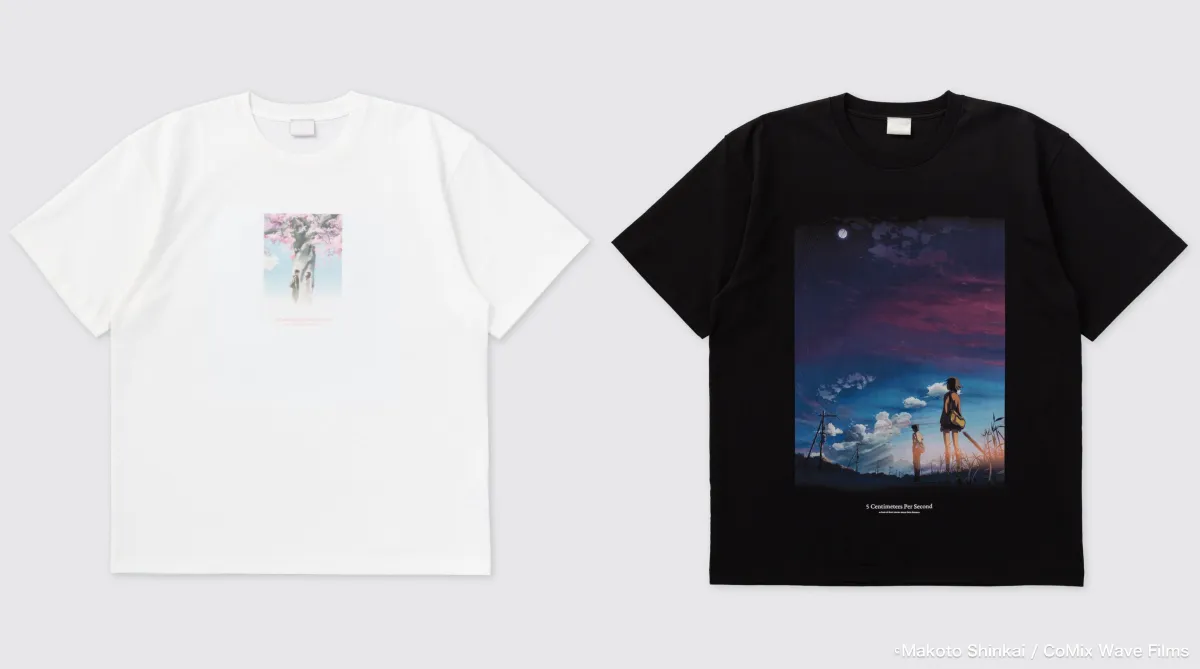 もう一つのTシャツは、第2話「コスモナウト」のビジュアルを使用しており、ロケット打ち上げを見上げる高校生の花苗と貴樹を描き出しています。ブラックの生地に空のグラデーションがマッチし、色調整を遂げたデザインはファン必見と言えるでしょう。