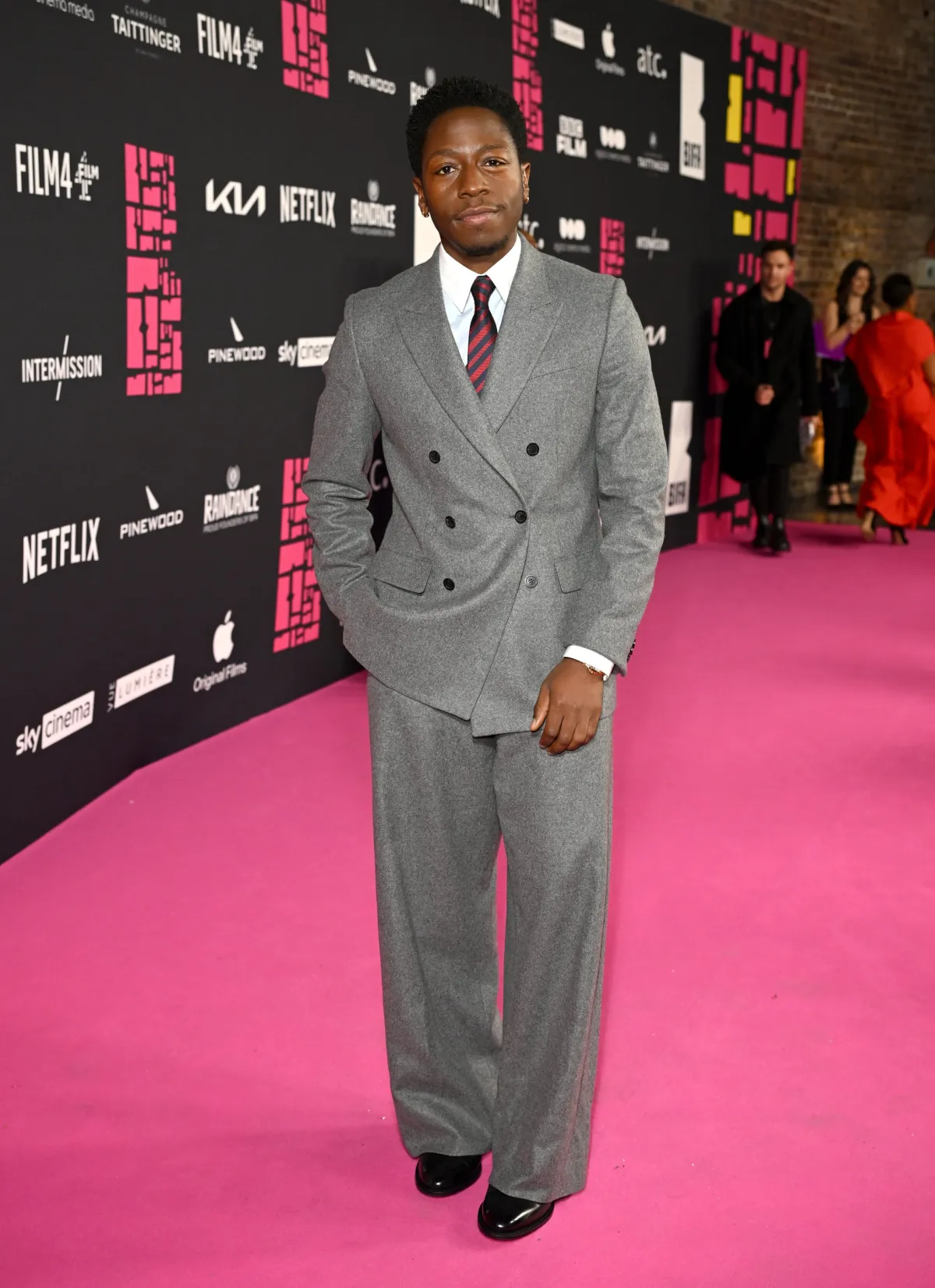 デヴィッド・ジョンソンは、特製のグレーウール素材で仕立てられたピークドラペルダブルブレストスーツを選びました。このスーツは、その上品さと力強さを兼ね備えたデザインで、彼の個性を引き立てます。スーツの特徴的なピークドラペルが、全体のシルエットをシャープに見せ、目を引く要素となっています。