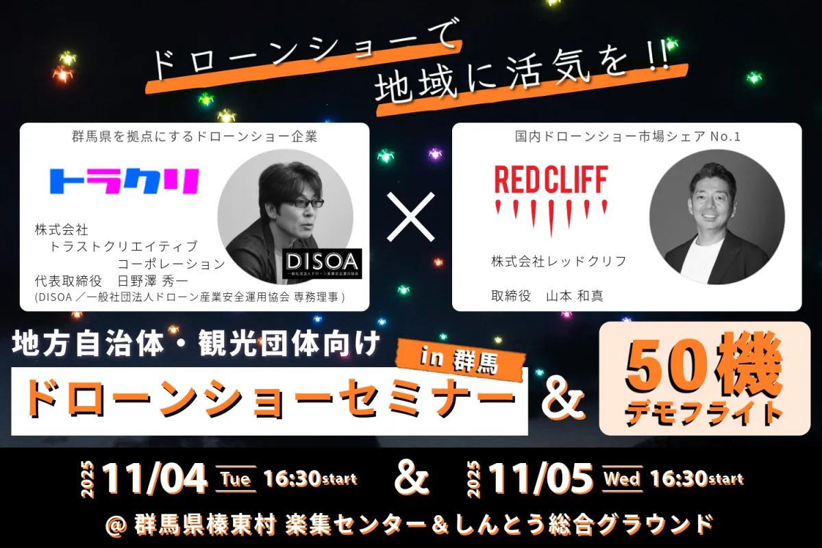 このセミナーでは、実際のドローンショー運営事例を取り上げ、導入コストや経済効果、自治体との連携モデルを具体的に紹介します。観光や地域イベントの新しい手法としてのドローンショーの可能性を、最新のトレンドとともにお伝えします。