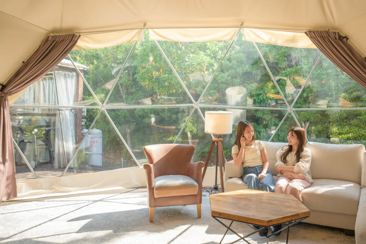 N.Terraceは、最大5名が宿泊できる広々としたドームテントです。専用のガーデンスペースが設けられており、開放的な空間の中で自然と一体となることができます。周囲は緑に囲まれており、まるで大自然の中にいるかのような感覚を味わえます。リニューアルにより、さらなる快適さが加わります。