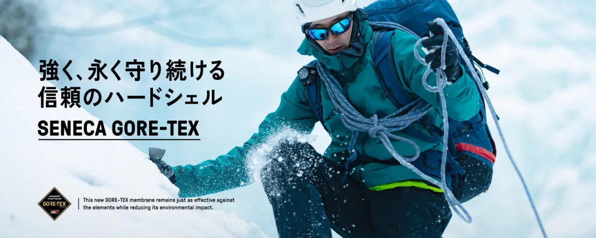 「SENECA GORE-TEX」シリーズは、従来の製品と同じ高機能性を持ちながら、持続可能性という新しい価値をプラスした革新的なアイテムです。特に、GORE-TEX ePEメンブレンの特徴として、耐久防水性や優れた透湿性に加え、高い防風性を持っているため、厳しい環境下でもその性能を発揮します。さらに、製品の長寿命を実現するために厳格なテストを実施しており、長く使うことで新たな製品の生産に必要なエネルギーや資源を節約できるのも大きな魅力です。