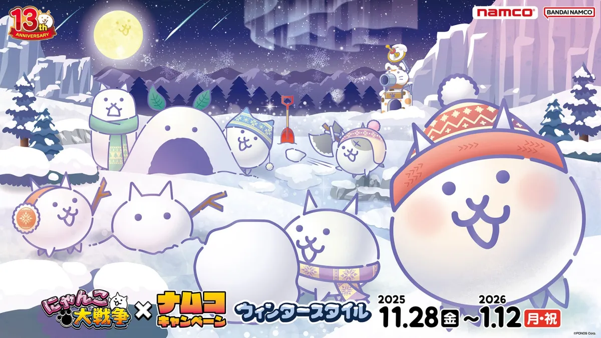 「にゃんこ大戦争×ナムコキャンペーン ウィンタースタイル」 と題されたこのイベントは、2025年11月28日から2026年1月12日まで、全国のアミューズメント施設「ナムコ」と「ナムコオンラインクレーン」で開催されます。