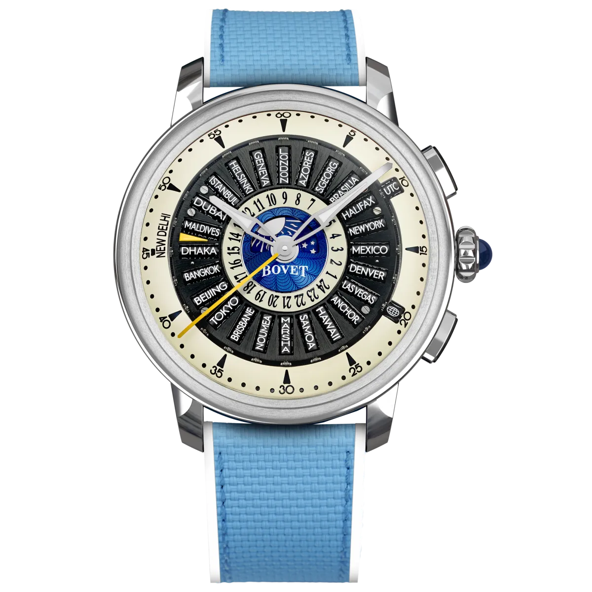 リサイタル30は、ボヴェの現行ラインナップの中でも特に革新的なワールドタイム時計として進化したモデルです。従来のワールドタイム機構が抱えていたサマータイム問題に対し、ボヴェは革新的な解決策を提示しました。これにより、年間を通じて正確な時刻表示を実現しています。